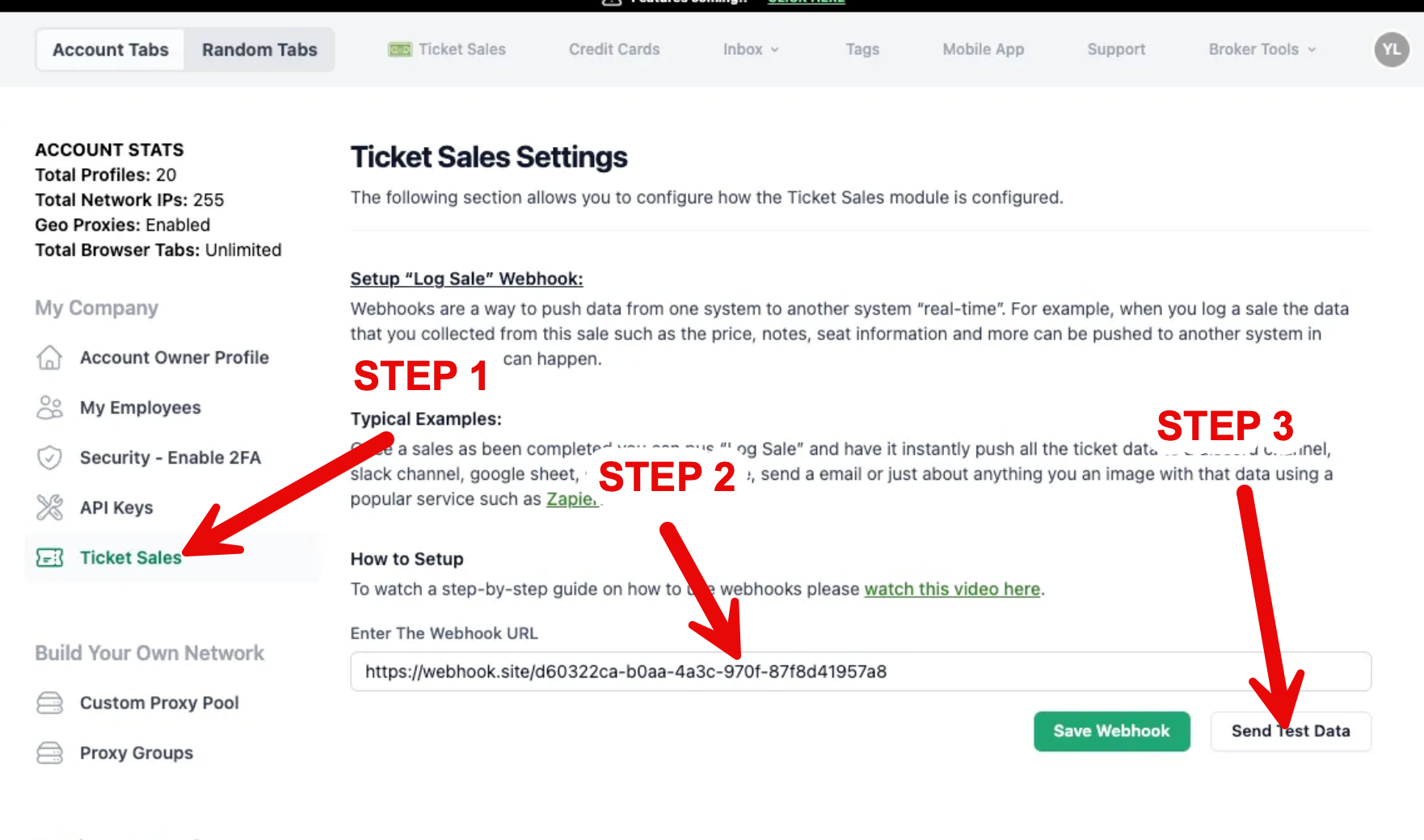 - On the left, select Sales Log Setting - Paste your webhook URL